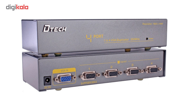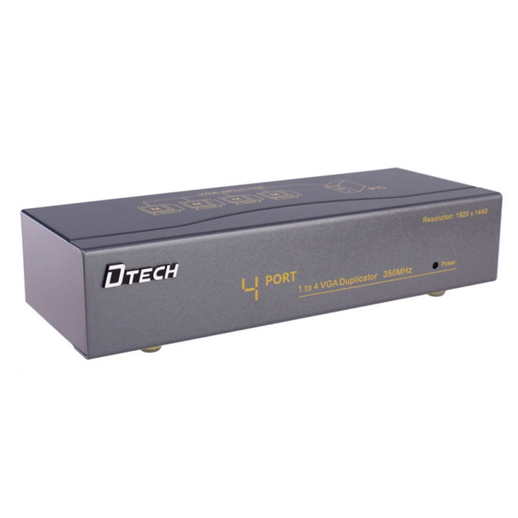 برای توضیح کارایی و کاربرد اسپلیتر VGA چهار پورت با کیفیت 350 مگاهرتز Dtech DT-7354 میتوان این را نمونه آورد که شما نیاز دارید در یک کنفرانس یا یک جلسه یا یک گردهمایی یا… بصورت همزمان تصویر یا ویدیو یا داده های پاورپوینت و .. را هم روی کیس کامپیوتر شخصی و یا لپ تاپ خود مشاهده کنید و هم به صورت همزمان تصاویر را برای بینندگان و دیگران روی 4 ویدیو پروژکتور یا تلویزیون LCD و LED یا مانیتور به نمایش بگذارید.اسپلیتر VGA چهار پورت با کیفیت 350 مگاهرتز Dtech DT-7354 وسیله ای برای تبدیل یک ورودی به چندین خروجی می باشد. با استفاده از ویدئو اسپلیتر می توانید خروجی کارت گرافیک خود را افزایش دهید و به صورت همزمان یک تصویر را روی چندین مانیتور نمایش دهید. این دستگاه در اکثر فروشگاهها مورد استفاده قرار می گیرد که می خواهند تبلیغات خود را روی چندمانیتور به صورت همزمان با کیفیت بالا بیندازند. پورت های این دستگاه از نوع VGA می باشد.عملکرد اسپلیتر dtech در واقع تکرار کار یک دستگاه پخش HD (نظیر DVD پلیر، گیرنده دیجیتال و …) است و پخش آنها را همزمان رو چند نمایشگر (مانند تلویزیون LED، پلاسما و …) انجام میدهد. نقطه ی مثبت در مورد اسپلیتر dtech این است که، سیگنالهای صوتی و تصویری را تکرار میکند.