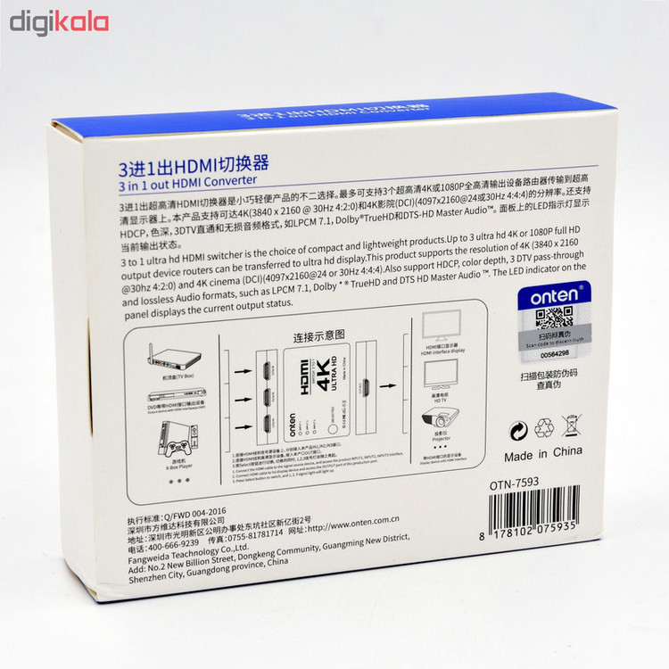 سوئیچ 3 به 1 HDMI اونتن مدل OTN-7593 با کیفیت 4K برای اشتراک گذاری چند سیستم پخش کننده ی تصویر بر روی یک نمایشگر استفاده میشود. این محصول یکی از کاربردیترین اقلامی است که امروزه با پیشرفت تکنولوژی استفاده از آن نیز به نوعی الزام تبدیل گشته است. سوئیچ اچ دی ام آی 3 پورت زمانی مورد استفاده قرار میگیرد که بخواهید از چند دستگاه شبیه هم در موقع لزوم استفاده کنید، درواقع ما قصد داریم یکی از محصولات کاربردی و مورد استفاده در اکثر سازمانها و حتی شبکههای کوچک و یا حتی خانگی را به شما معرفی کنیم.این وسیله اتصال کننده دستگاهای پخش کننده به نمایشگر بصورت جداگانه است. بوسیله دکمه ی تعبیه شده روی دستگاه میتوان به صورت جداگانه پورت دستگاه را سوئیچ کرد. مدل OTN-7593 با پشتیبانی از بالاترین و بهترین کیفیت تصویری 4K Ulrta HD توانایی اتصال سه دستگاه گوناگون مانند پلی استیشن، رسیور، سینمای خانگی، گیرنده دیجیتال، دوربین، ایکس باکس ( باخروجی HDMI ) را به صورت همزمان به یک تلویزیون LCD یا LED دارای ورودی HDMI را دارد.
