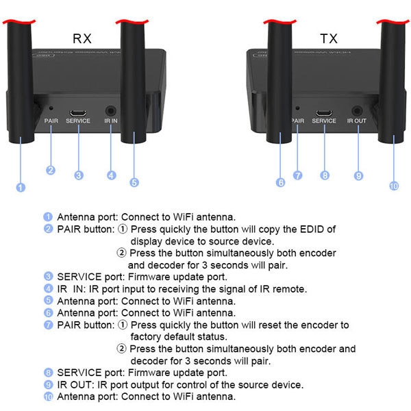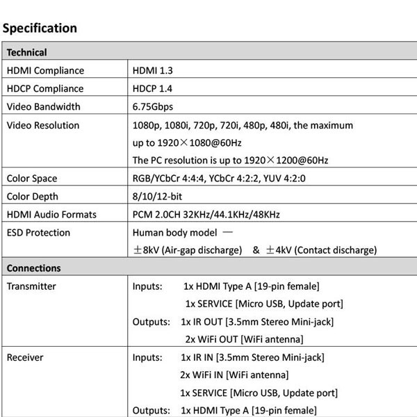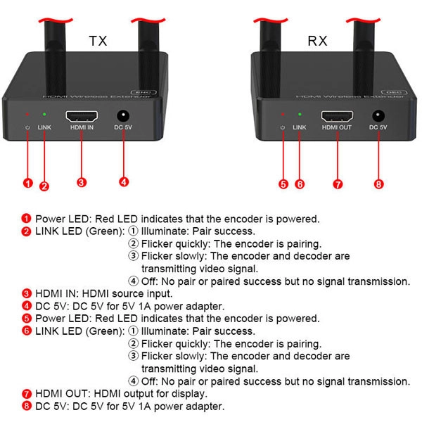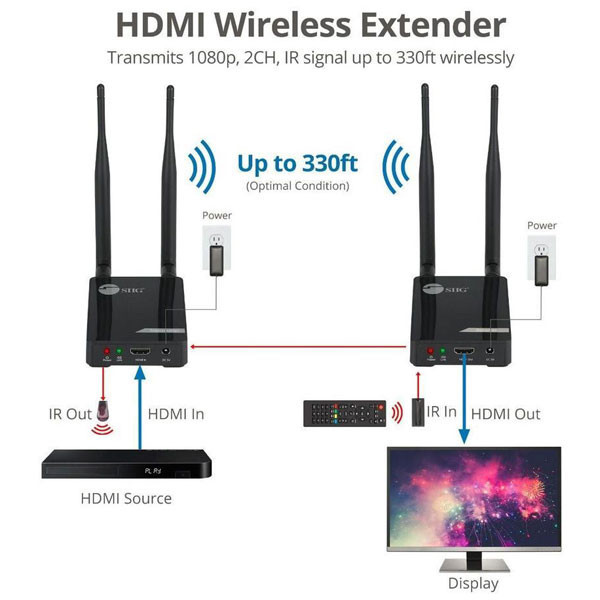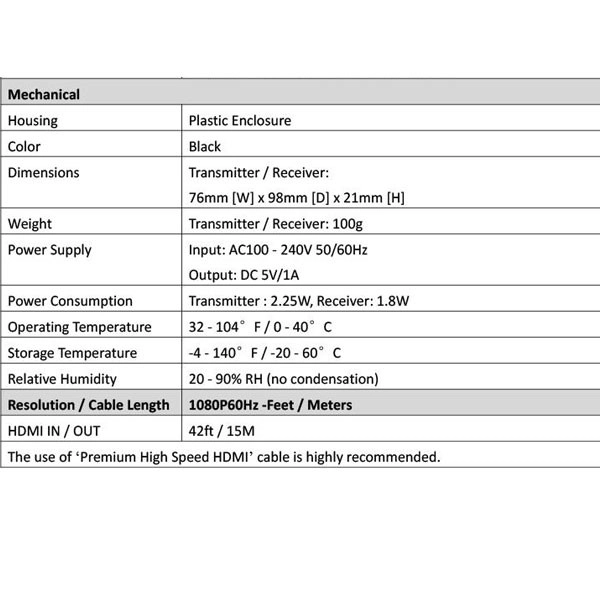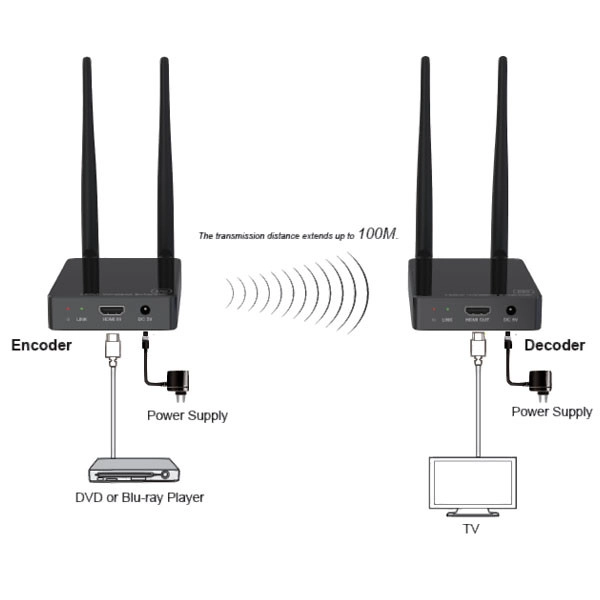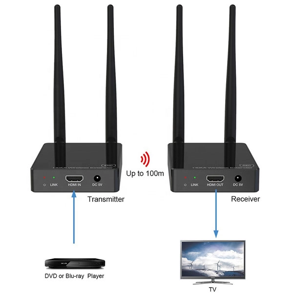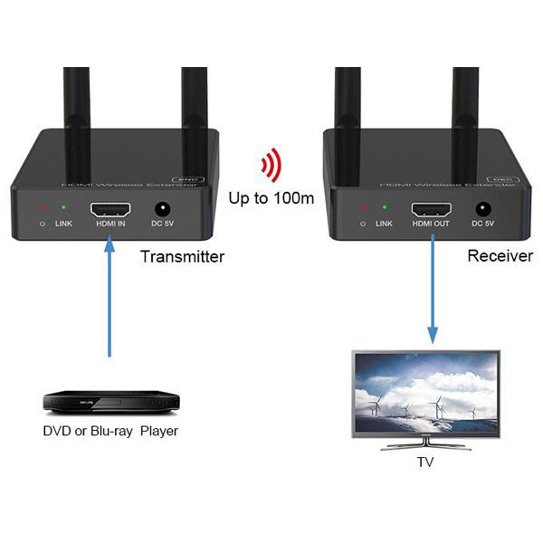 دستگاه فرستنده و گیرنده طول 100 متری HDMI با دو عدد رادیو 2.4Ghz شبکه تصاویر را بدون نویز و به صورت FULL HD و با کیفیت بالا 1080P انتقال می دهد.کارکرد دستگاه به این شکل هست که دستگاه فرستنده (TX) در مبدا با ورودی تصویر HDMI و USB و آداپتور برق قرار می گیرد و دستگاه گیرنده با نام (RX) در انتها که نمایشگر متصل باشد ، به طور مثال مبدا می تواند دستگاه DVR - نوت بوک - کامپیوتر - گیرنده دیجیتال - اندروید باکس باشد که تصویر داخلی رو از پورت HDMI خروجی می دهند و می توان با استفاده از کابل HDMI مرغوب اتصال بین دستگاه فرستنده برقرار کرد . دستگاه گیرنده با خروجی پورتهای HDMI اتصال بین نمایشگر (تلویزیون - مانیتور - دیتا پروژکتور ) اتصال داد. فاصله بین دو دستگاه می تواند تا 100 متر پشتیبانی کند .