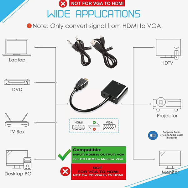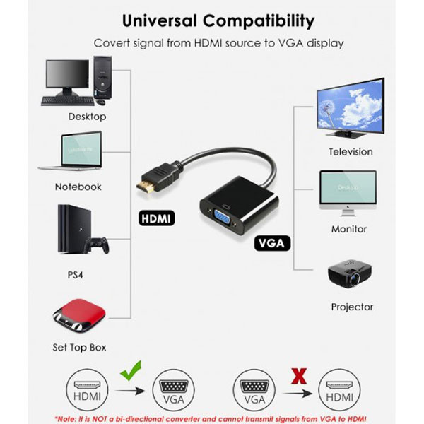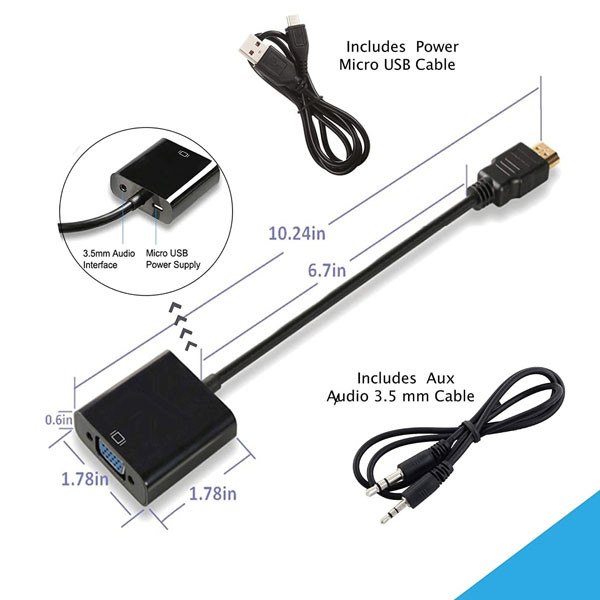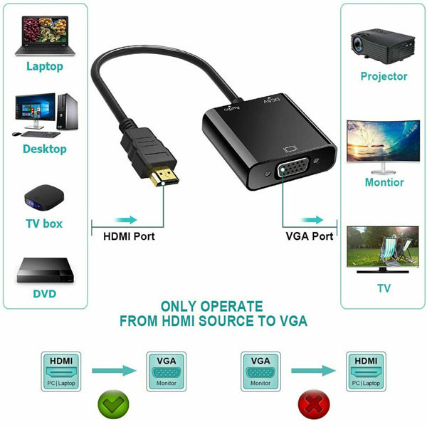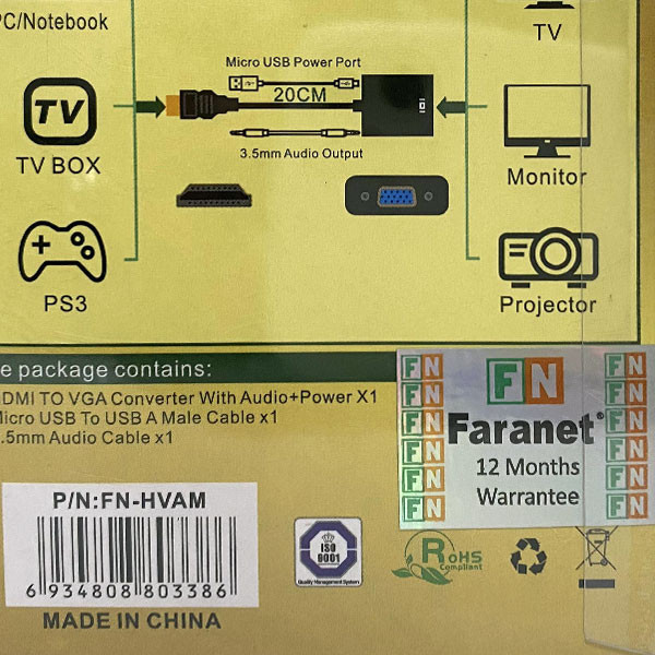 توسط مبدل HDMI to VGA برند فرانت مدل FN-HVAM خواهید توانست خروجی دستگاههای دارای پورت HDMI را به دستگاه های دارای ورودی پورت VGA متصل کنید . توسط این مبدل خواهید توانست تمام دستگاه های مجهز به خروجی پورت HDMI مانند انواع نوت بوک ، کامپیوتر ، DVR و ... را به انواع مانیتور و ویدئو پروژکتورهای با ورودی VGA وصل کنید . پورت تفکیک صدا 3.5 میلیمتری برای خروجی مجزا و اتصال به اسپیکر دارد. پورت Micro-B جهت تغذیه برد برای اتصال به دستگاه هایی که ولتاژ خروجی HDMI آنها ضعیف هستند می باشد.